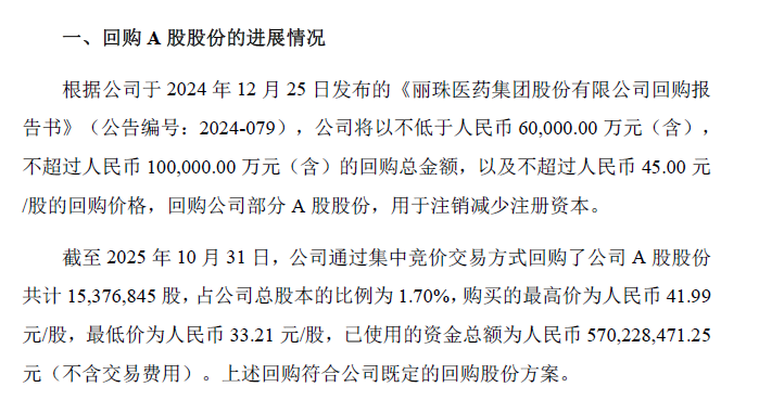 丽珠集团公告显示,截至2025年10月31日,公司通过集中竞价交易方式回购了公司A股股份共计15,376,845股,占公司总股本的比例为1.70%,购买的最高价为人民币41.99元/股,最低价为人民币33.21元/股,已使用的资金总额为人民币570,228,471.25元(不含交易费用)。