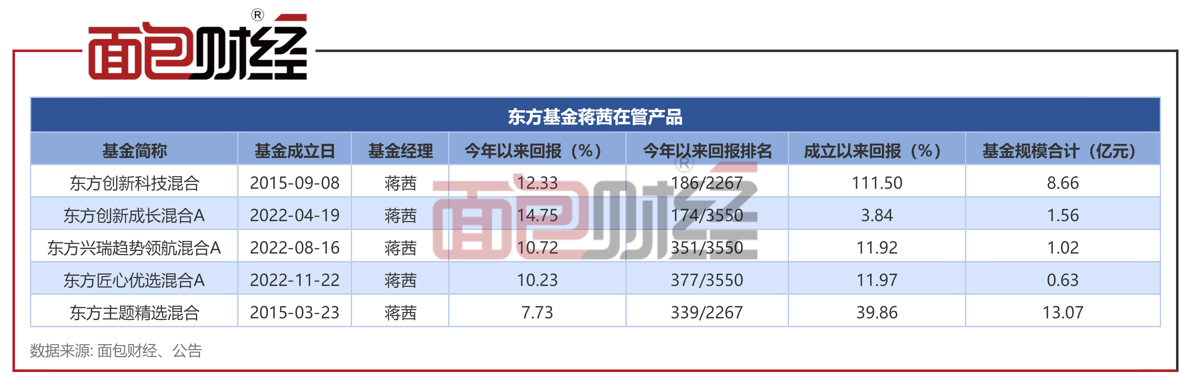 目前,蒋茜主要管理东方主题精选混合、东方创新科技混合、东方创新成长混合等5只产品(初始基金口径),上述产品合计规模约24.93亿元。5只基金今年以来净值上涨超过7%。