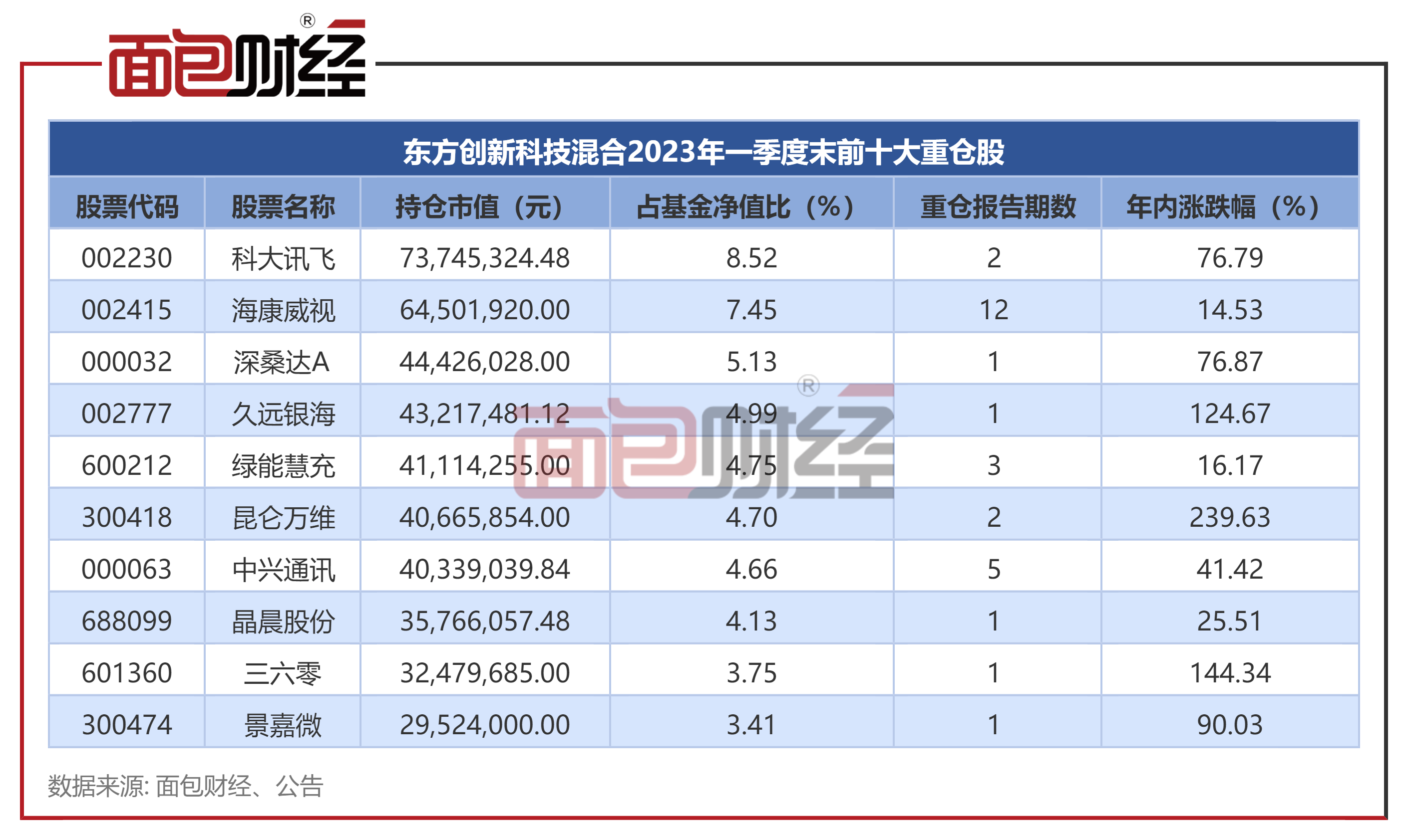 2023年一季度末,东方创新科技混合股票持仓占基金总资产的比例为92.21%,其中前十大重仓股占基金资产净值的比例为51.48%。