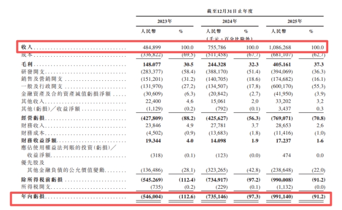 招股书显示,2023年、2024年及2025年,SmartMore的营收分别为4.85亿元、7.56亿元及10.86亿元;年内亏损分别为5.46亿元、7.35亿元及9.91亿元,经调整净亏损(非国际财务报告准则计量)分别为3.94亿元、3.79亿元及2.72亿元。