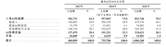 从收入构成来看,工业AI智能体为SmartMore核心业务,2023年、2024年及2025年收入占比分别达到62.4%、73.8%及78.5%。
