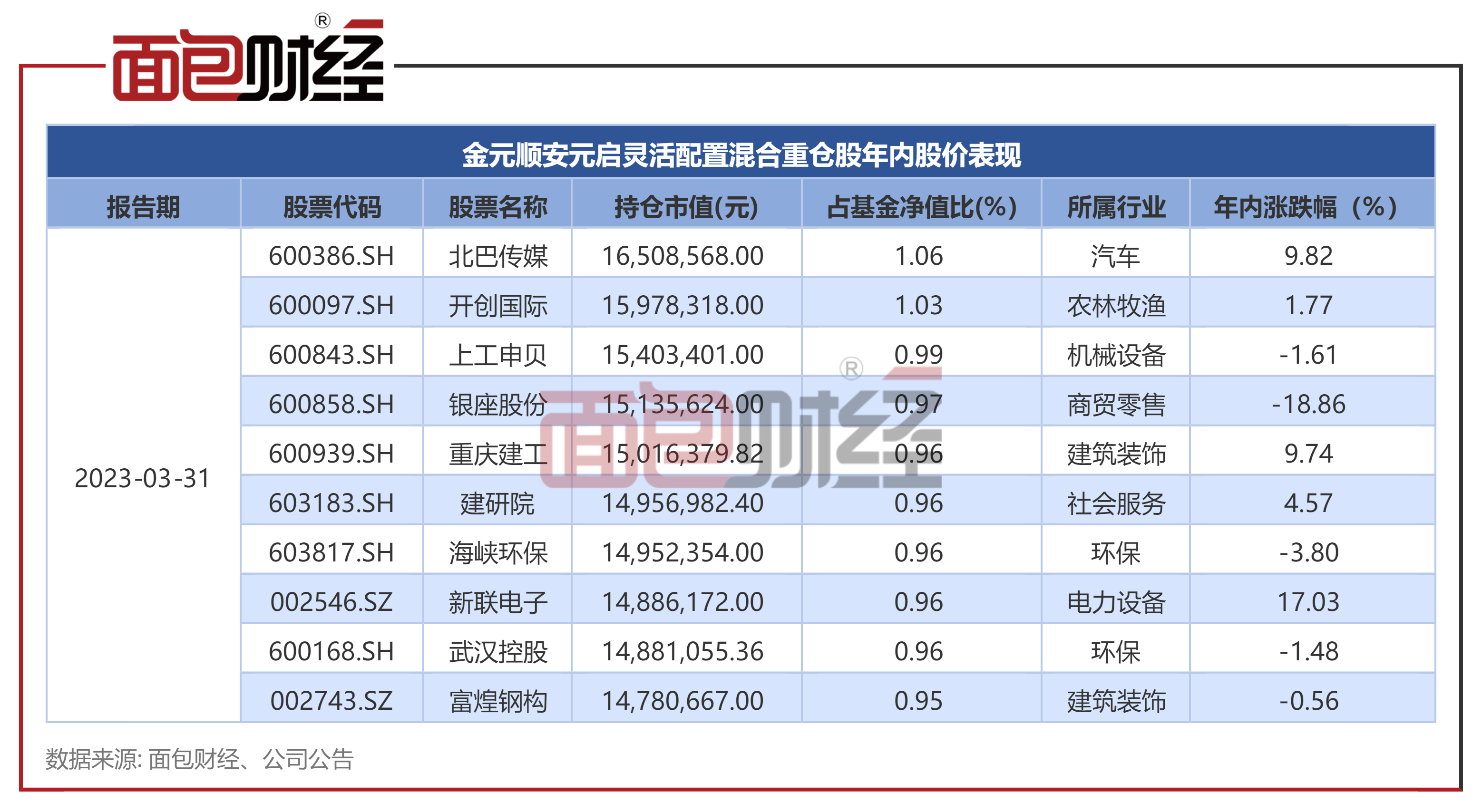金元顺安元启灵活配置混合前十大重仓股占基金资产净值的比例为9.79%,持仓较为分散。其中,北巴传媒、开创国际、上工申贝为该基金的前三大重仓股。