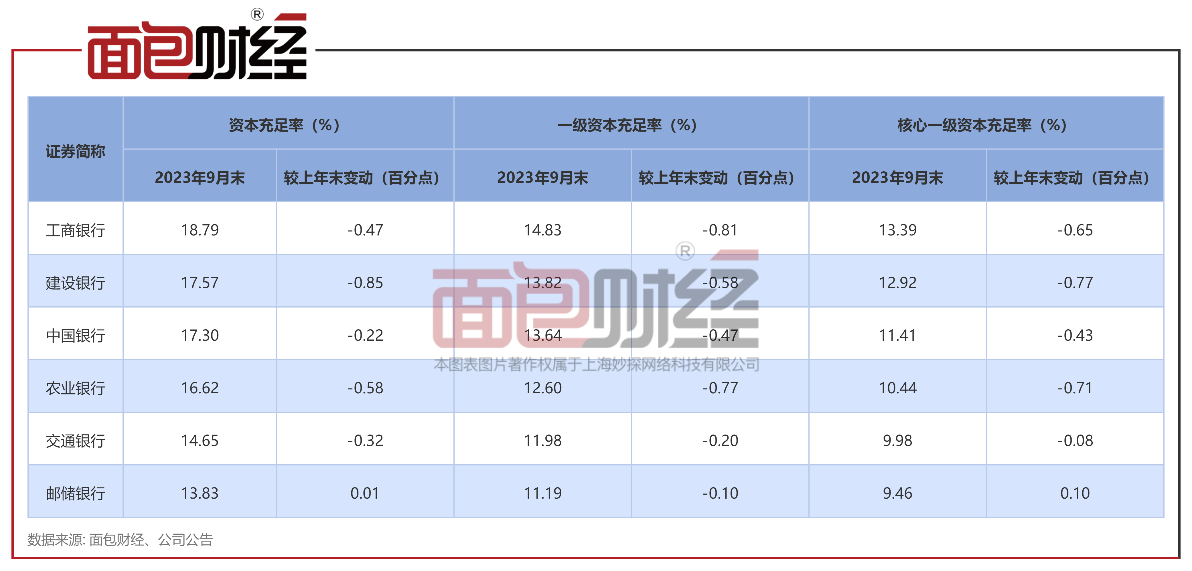 数据显示,截至2023年9月末,6家国有银行的资本充足率指标虽有下降,但均处于较高水平。