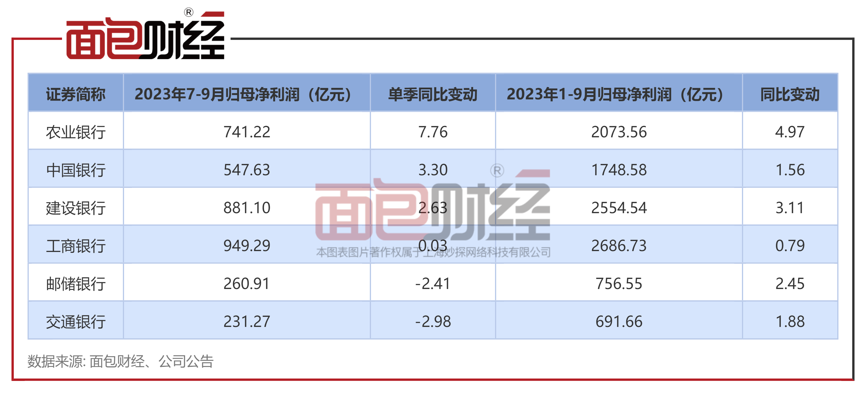 随着2023年三季报收官,面包财经研究员对六家国有银行的经营业绩及核心监管指标进行了整理。