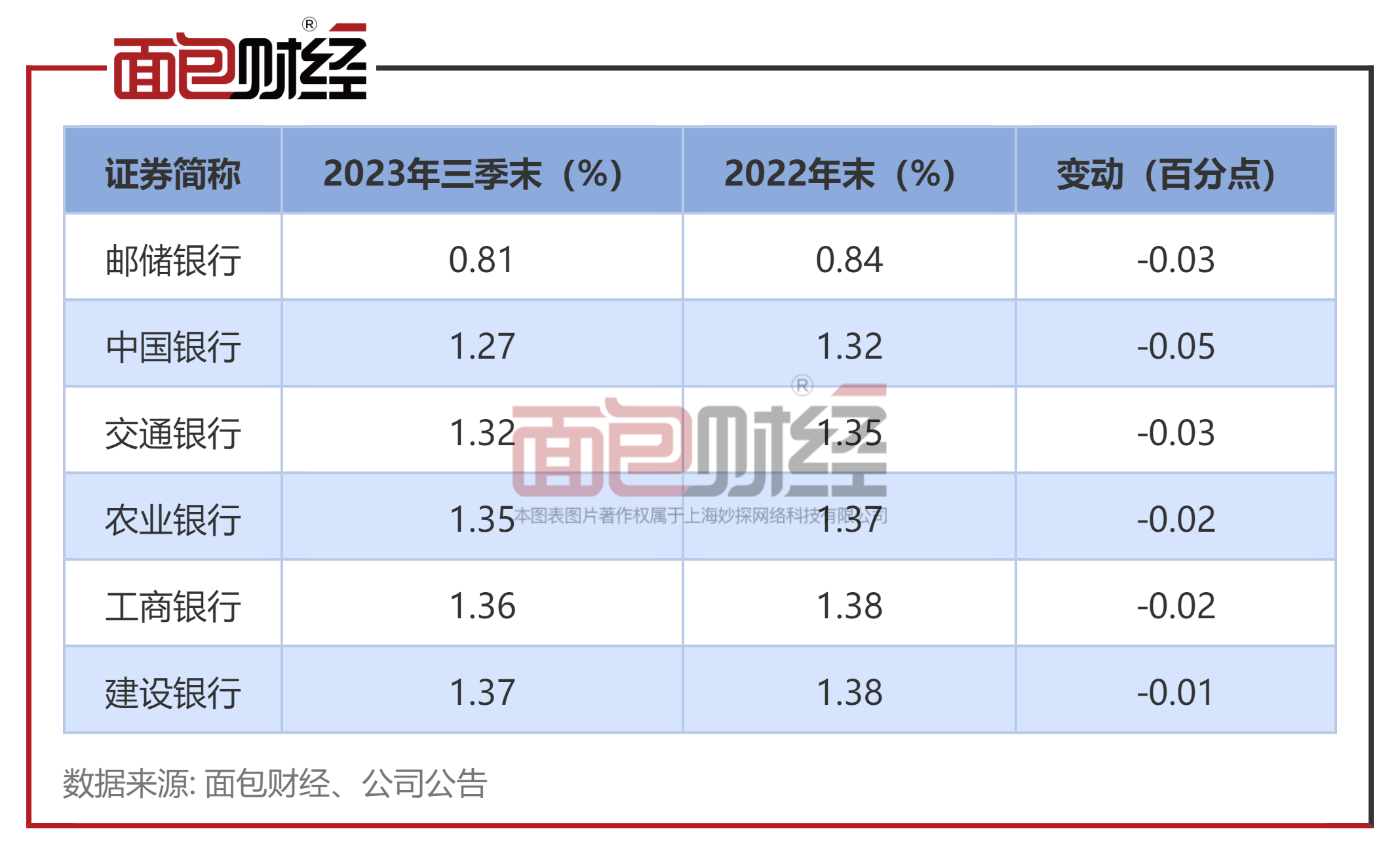 截至2023年三季末,邮储银行的不良贷款率最低,为0.81%。较上年末相比,6家国有银行的不良贷款率均有下降。其中,中国银行的降幅较大,较上年末下降0.05个百分点。