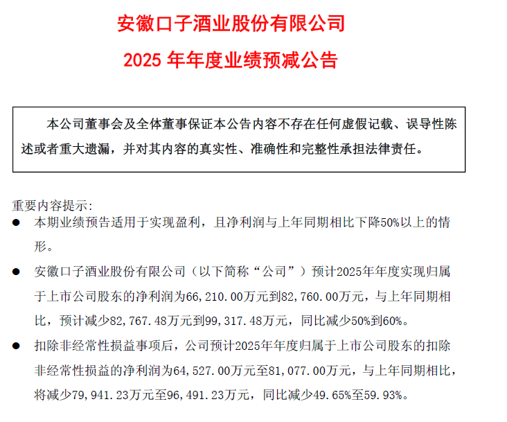 口子窖、金种子酒、*ST岩石也已披露2025年业绩预告。口子窖预计2025年年度实现归母净利润6.62亿元至8.28亿元,同比减少50%到60%;金种子酒则预计2025年度经营业绩将出现亏损,但亏损幅度预计同比将会收窄。