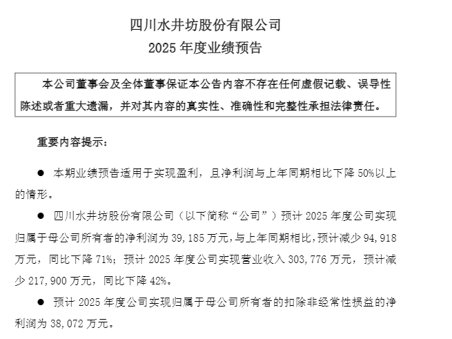 水井坊(600779.SH)近日披露了2025年度业绩预告。公告显示,公司预计2025年实现归母净利润3.92亿元,同比下降71%;实现营业收入30.38亿元,预计同比下降42%。