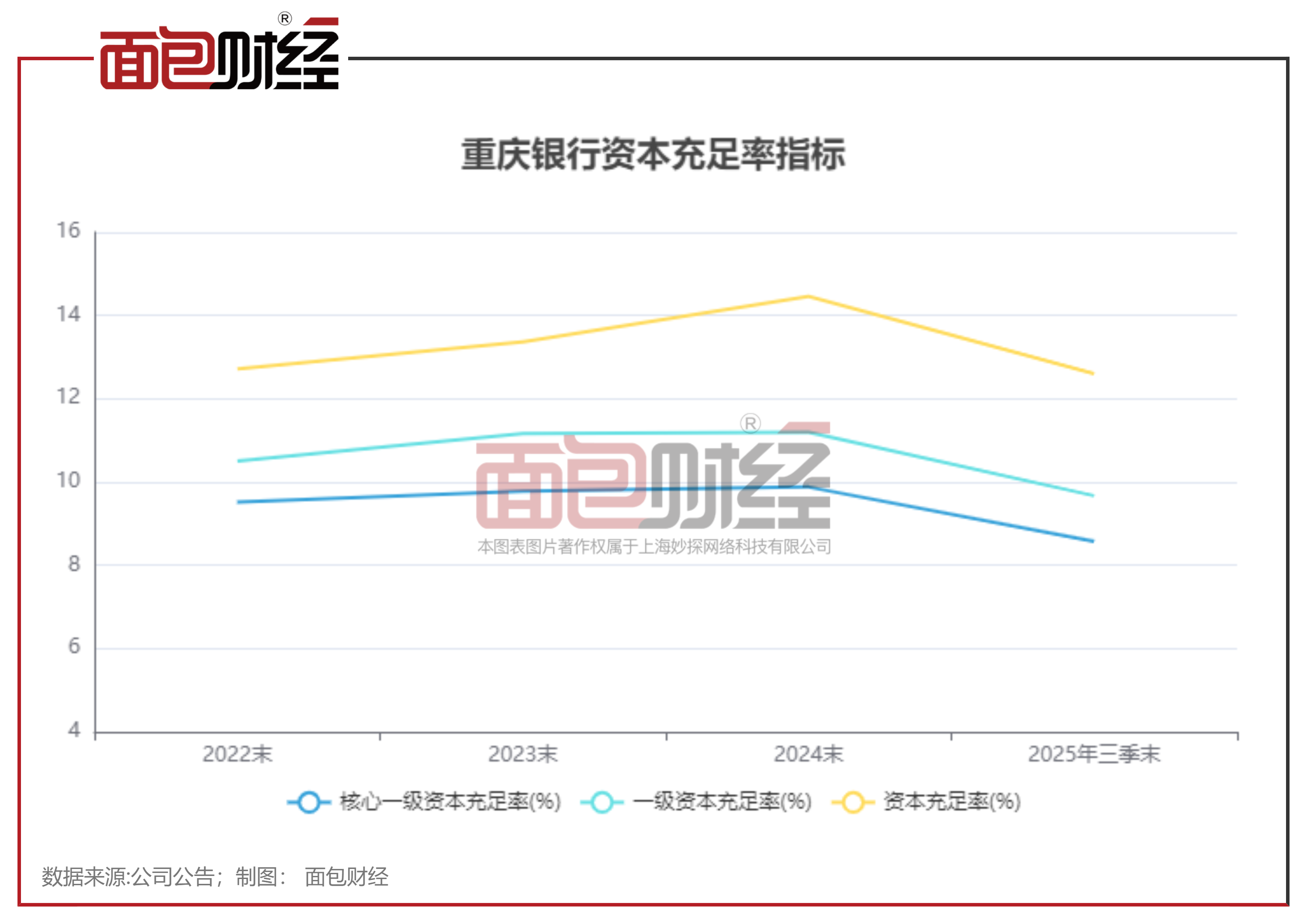 截至2025年9月末,该行核心一级资本充足率、一级资本充足率和资本充足率分别为8.57%、9.67%和12.60%,较中报数据8.8%、9.94%和12.93%相比进一步下降。与上年末相比,降幅更为明显,核心一级资本充足率、一级资本充足率和资本充足率分别下降1.31、1.53和1.86个百分点。