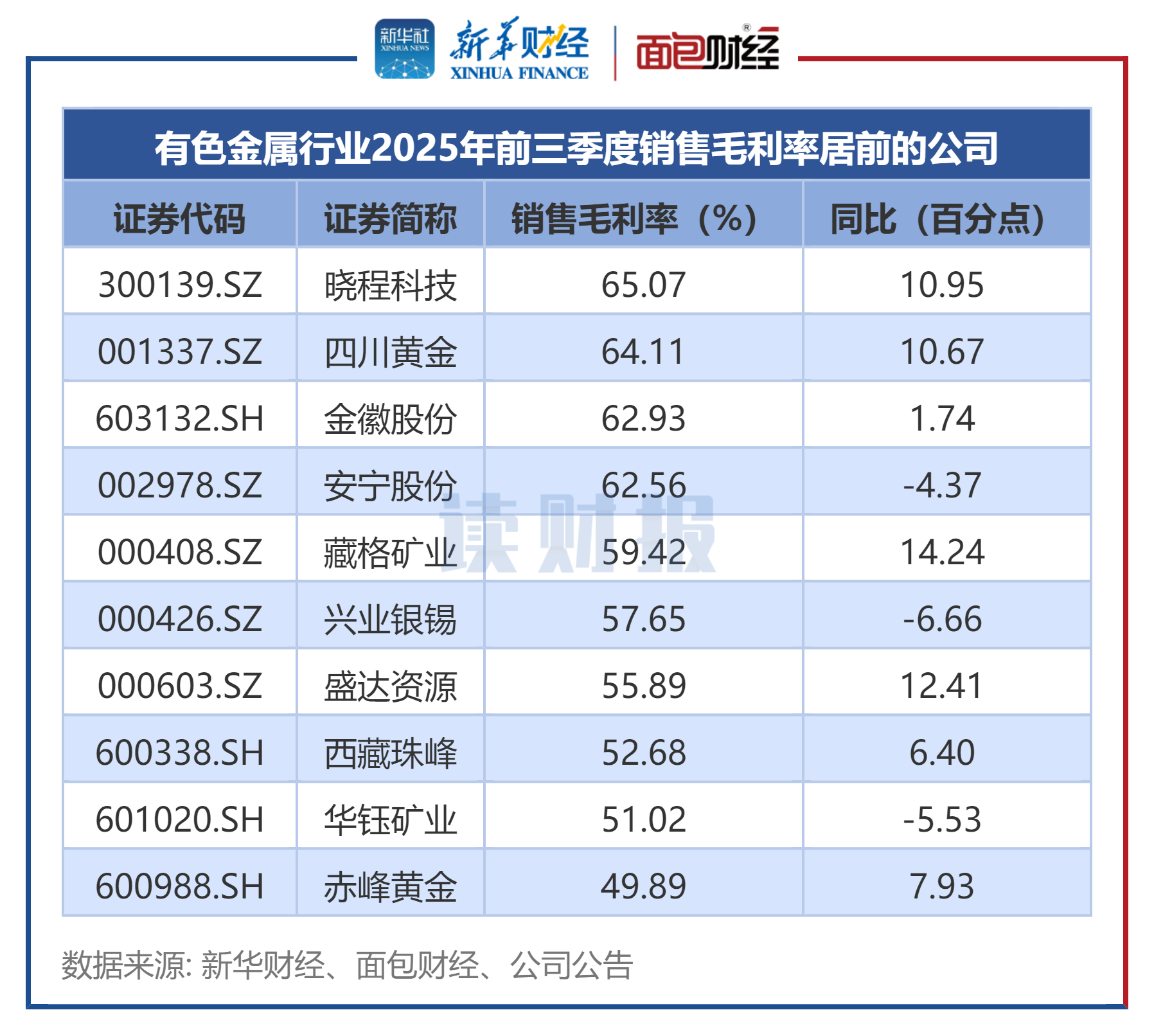 毛利率方面,A股有色金属企业2025年前三季度平均毛利率约18.15%,同比上升0.47个百分点。招金黄金、藏格矿业、晓程科技、四川黄金等公司毛利率同比上升幅度居前。