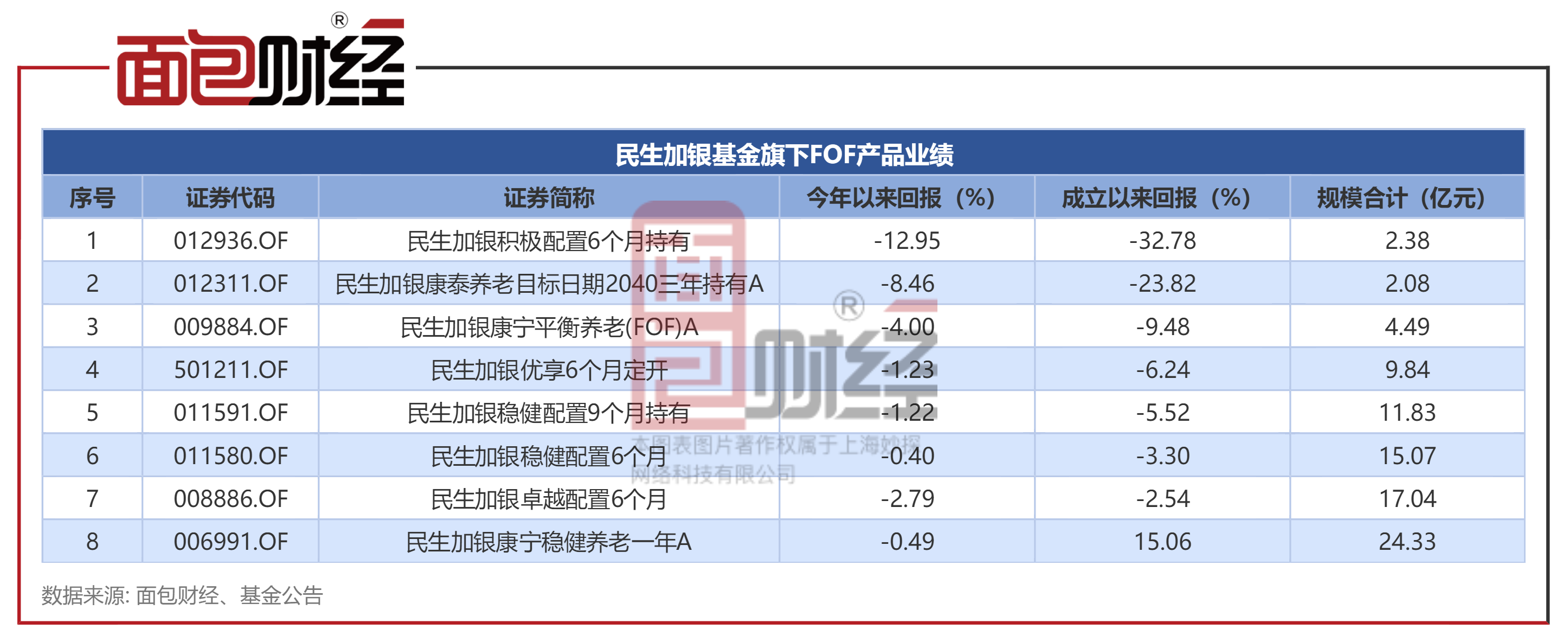 目前,民生加银基金在管8只FOF产品2023年以来收益全部告负,其中7只成立至今累计回报为负,8只产品成立至今平均跌超8%。