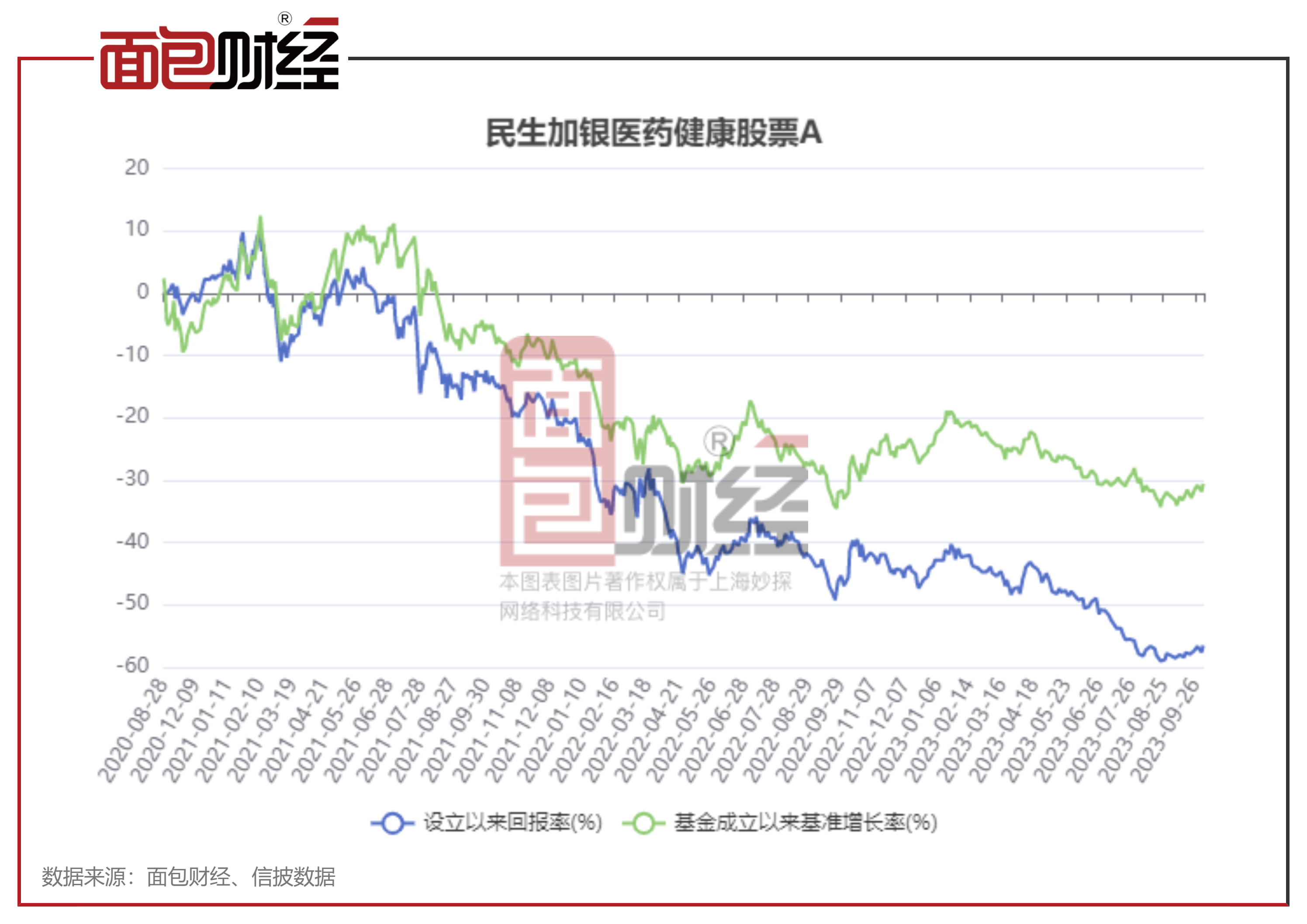 截至2023年10月11日(下同),民生加银医药健康股票A成立3年多累计亏损56.54%,跑输业绩比较基准逾25个百分点,同类排名455/456,表现垫底。