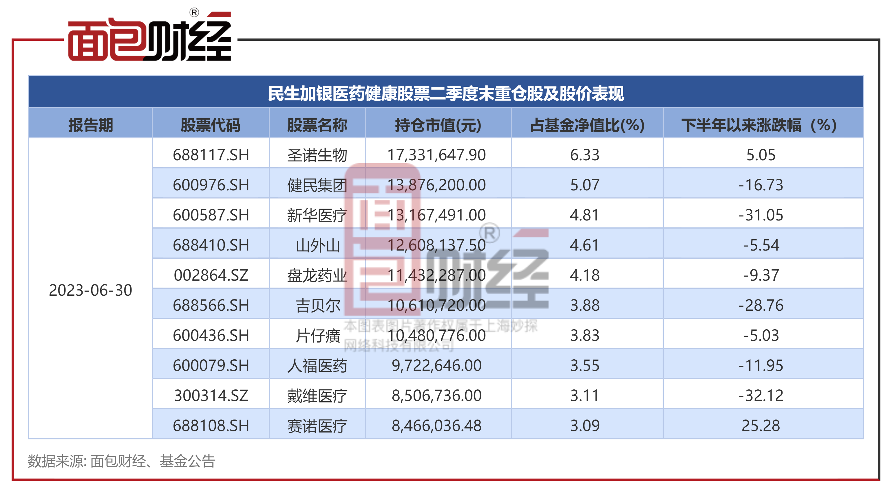 数据显示,该基金2022年的换手率达到1019.23%,2023年上半年为352.58%。根据2023年中报,民生加银医药健康股票的股票投资金额占基金总资产的比例为87.97%,重仓股包括圣诺生物、健民集团、新华医疗、山外山、盘龙药业、吉贝尔等企业,多数为二季度新重仓。