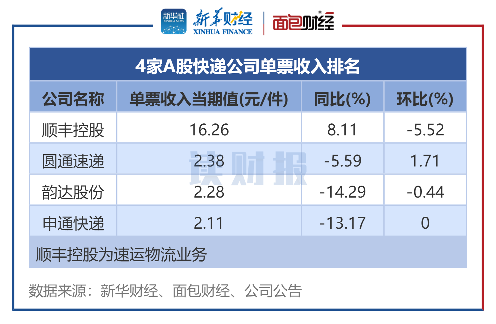 从单票收入来看,顺丰控股的10月单票收入为16.26元/件,圆通速递、韵达股份及申通快递的单票收入均在2元/件至2.5元/件之间。