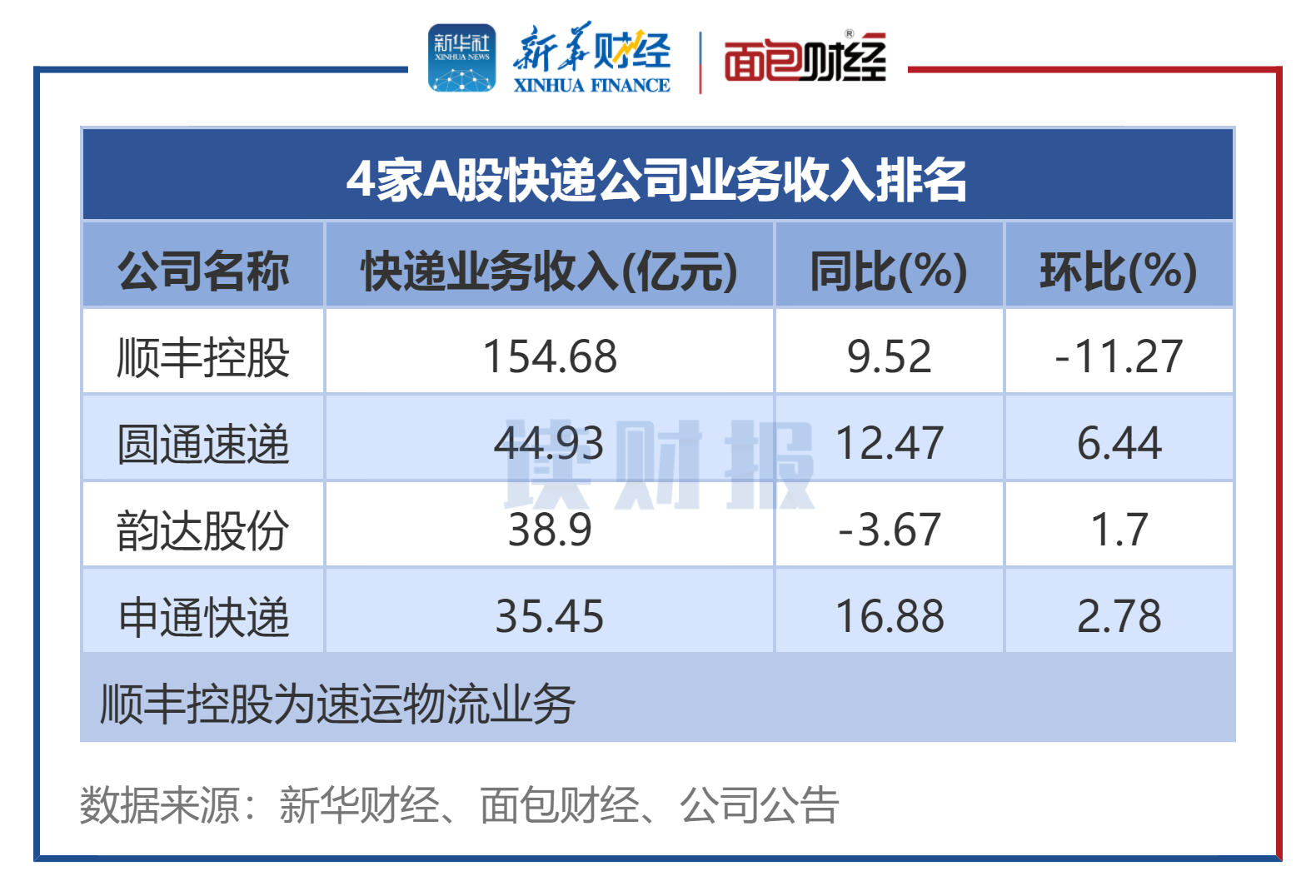 业务收入:韵达股份同比下降 顺丰控股环比下降