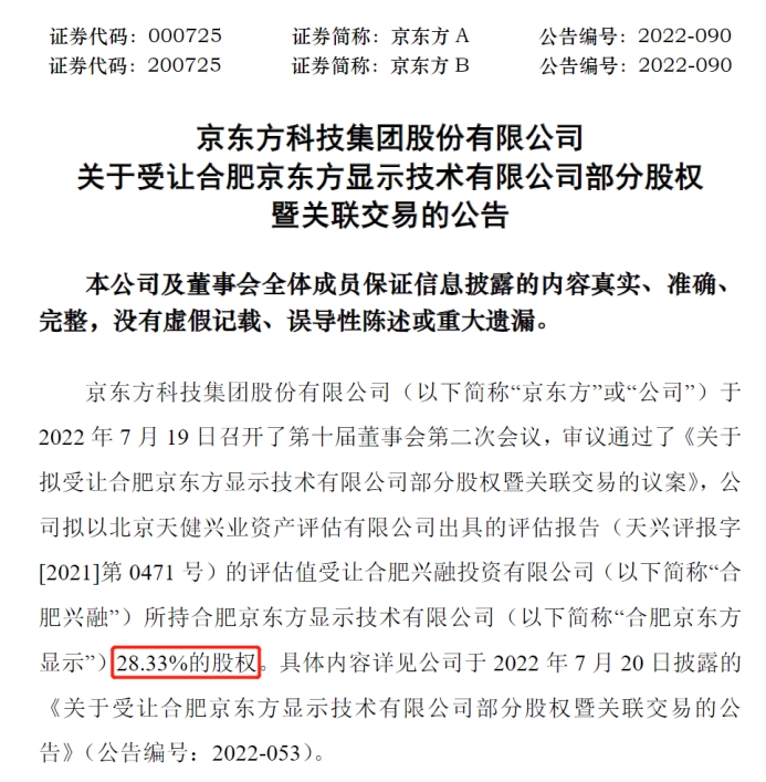 京东方A:拟以69.29亿元受让合肥京东方显示28.33%股权