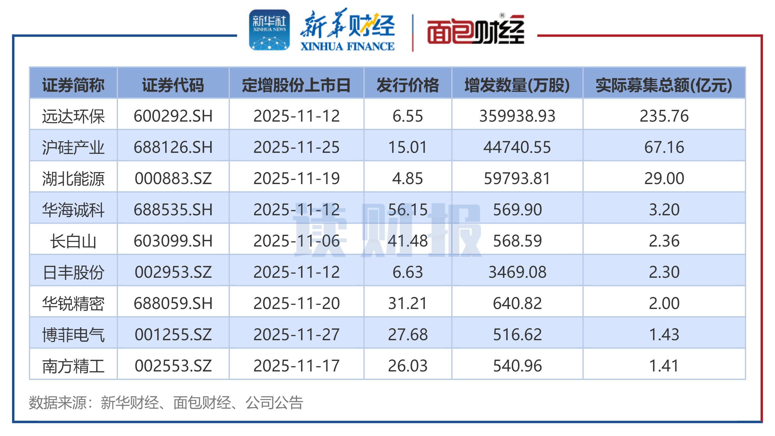 统计显示,2025年11月,A股上市公司共计实施定增9起,同比下降36%;实际募资总额约344.61亿元,同比上升147%。其中,远达环保、沪硅产业、湖北能源的募资规模位居前三。