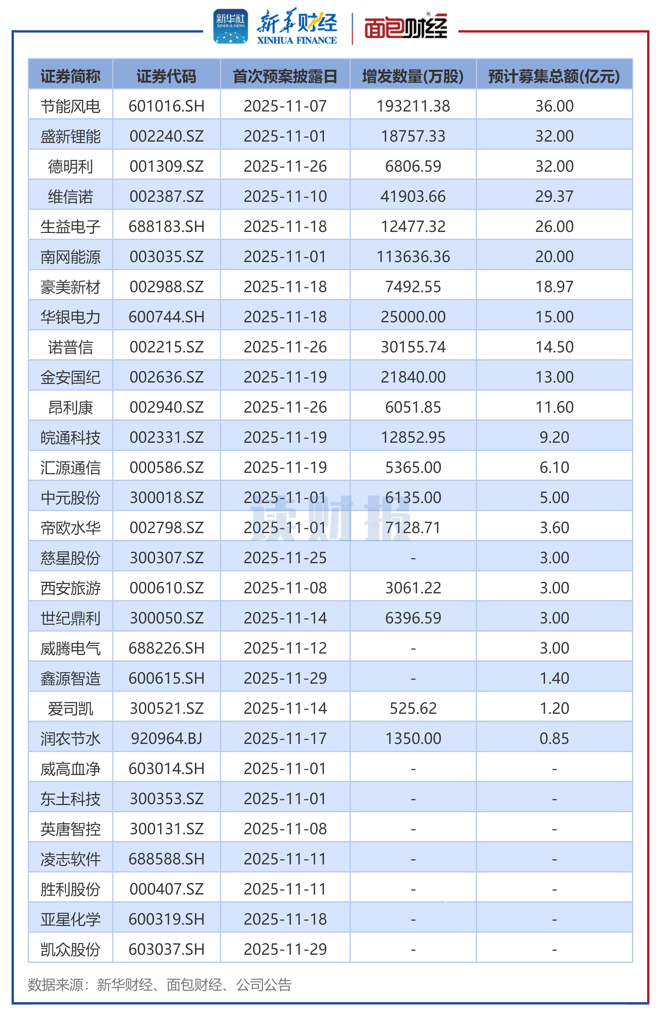 按照首次披露预案日口径统计,2025年11月A股上市公司定增预案发布数量共计29起,拟募资规模约287.79亿元,同比下降34.53%。其中,节能风电、盛新锂能、德明利等企业拟募资规模相对靠前。