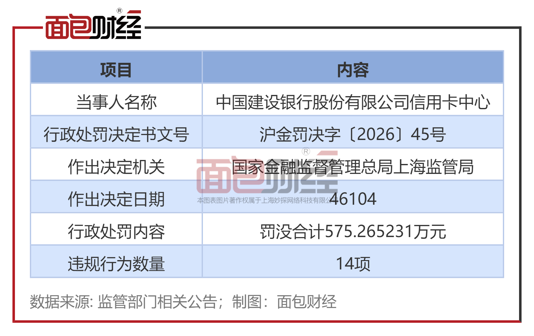 2026年3月23日,国家金融监督管理总局上海监管局发布行政处罚信息公开表,对中国建设银行股份有限公司信用卡中心作出行政处罚,罚没合计575.265231万元(处罚决定书文号:沪金罚决字〔2026〕45号)。本次处罚涉及14项违法违规行为,覆盖信用卡全业务链条,同时两名时任风险管理处副处长被警告并各罚款5万元。这是近年来信用卡业务领域金额较大的单笔处罚之一,引发市场广泛关注。