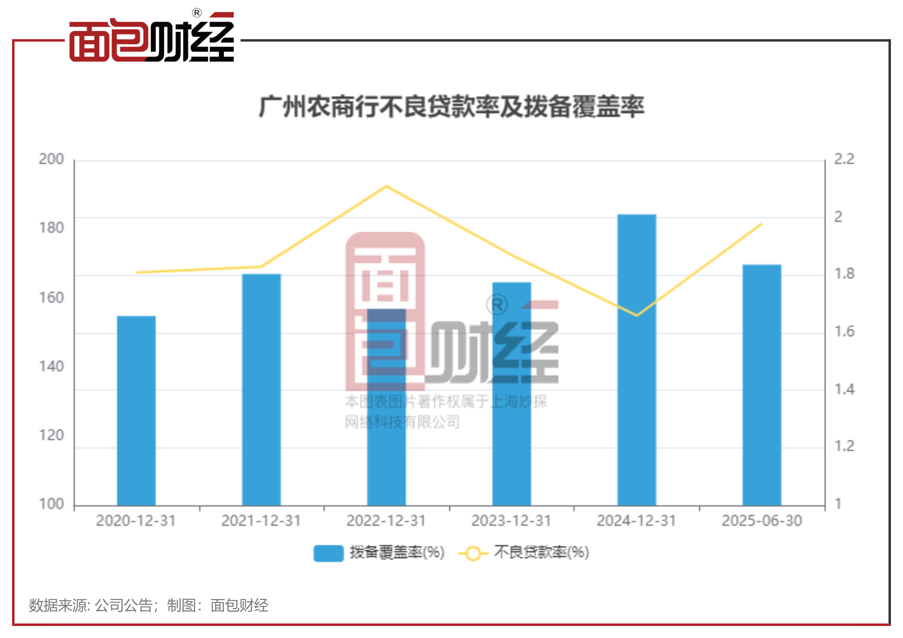 财报数据显示,截至2025年6月末,广州农商银行的不良贷款率为1.98%,较2024年末上升0.32个百分点。而该行的拨备覆盖率较2024年末下降14.59个百分点至169.75%。