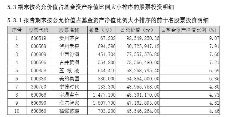 基金重仓白酒板块,四季度末前五大重仓股均为白酒上市公司,包括贵州茅台、泸州老窖、山西汾酒、古井贡酒、五粮液。其他重仓股包括美的集团、宁德时代、宇通客车等。