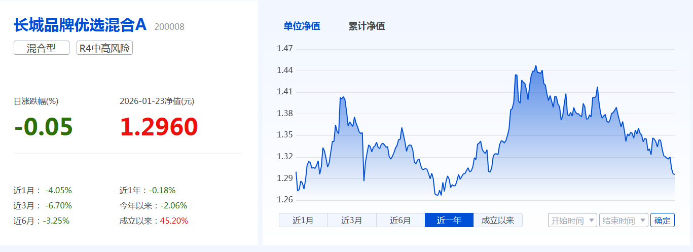 Wind数据显示,截至2026年1月23日(下同),长城品牌优选混合A年内净值下跌2.06%,跑输业绩基准超过3个百分点;过去一年净值下跌0.18%,跑输业绩基准超19个百分点;过去五年净值跌幅达50.33%,基金规模大幅萎缩。
