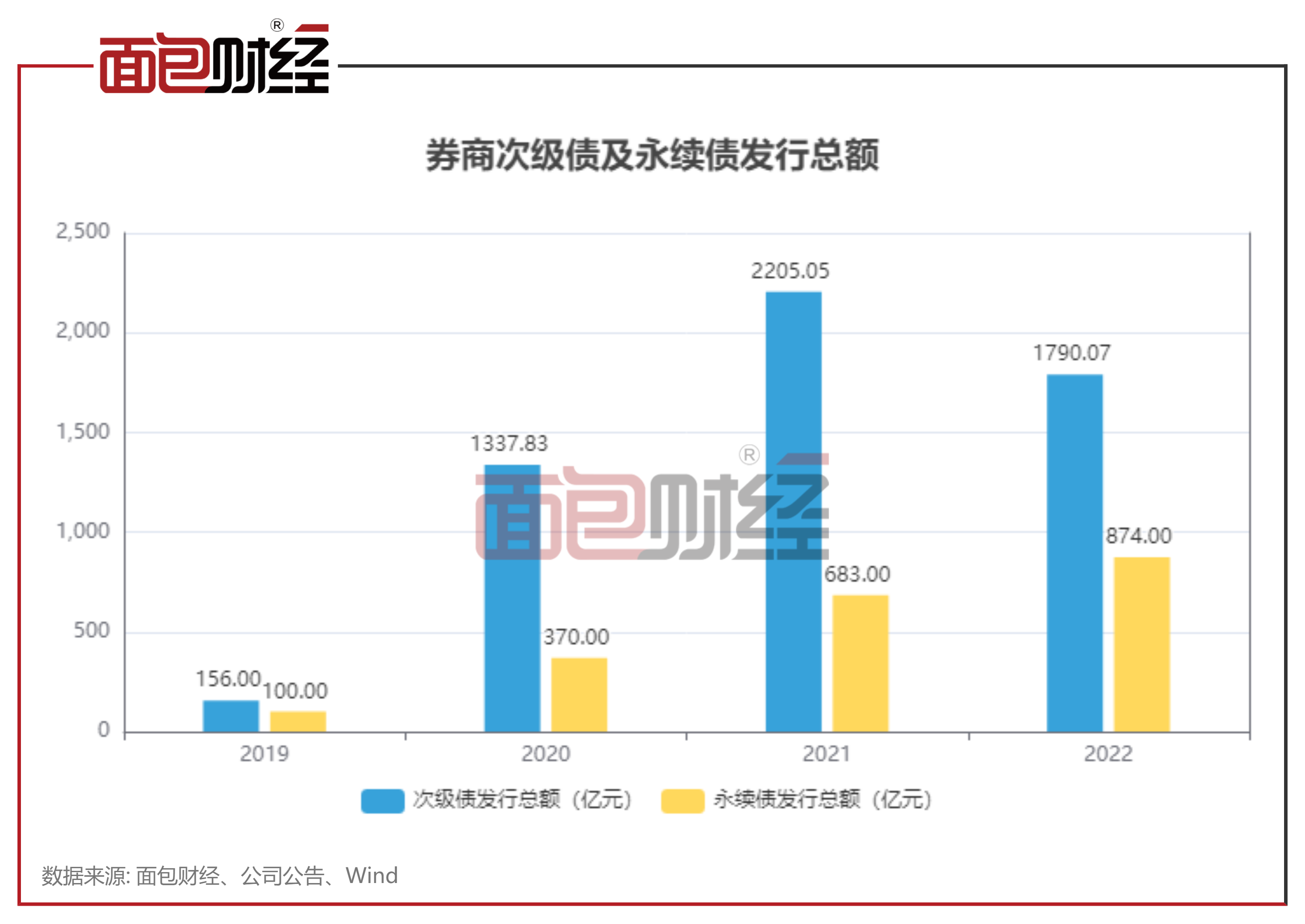 2022年,券商次级债的发行总额为1790.07亿元,较2021年减少414.98亿元;永续债的发行总额为874亿元,较2021年增加191亿元。