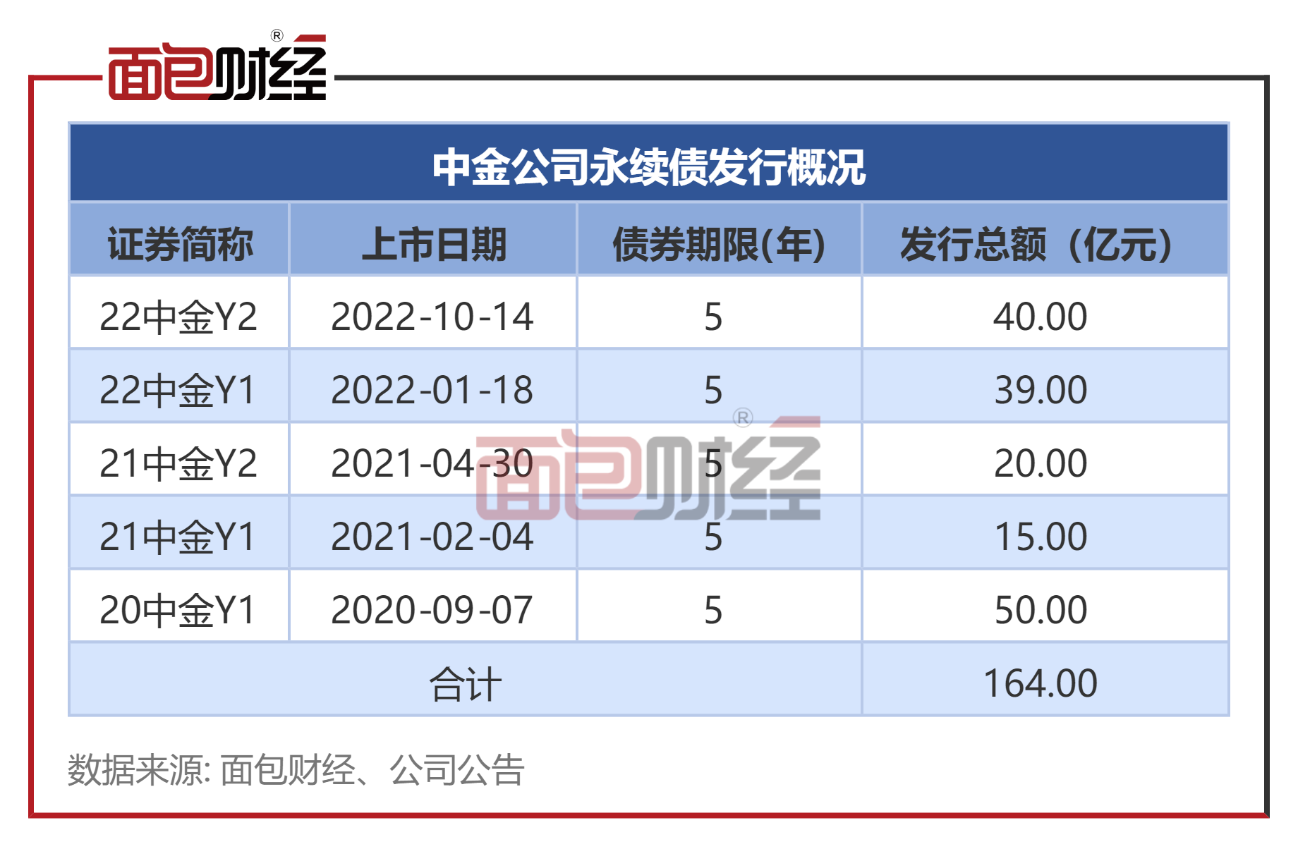 数据显示,2020年至2023年2月16日,中金公司次级债的发行规模为199亿元,其中,永续债的发行规模为164亿元。