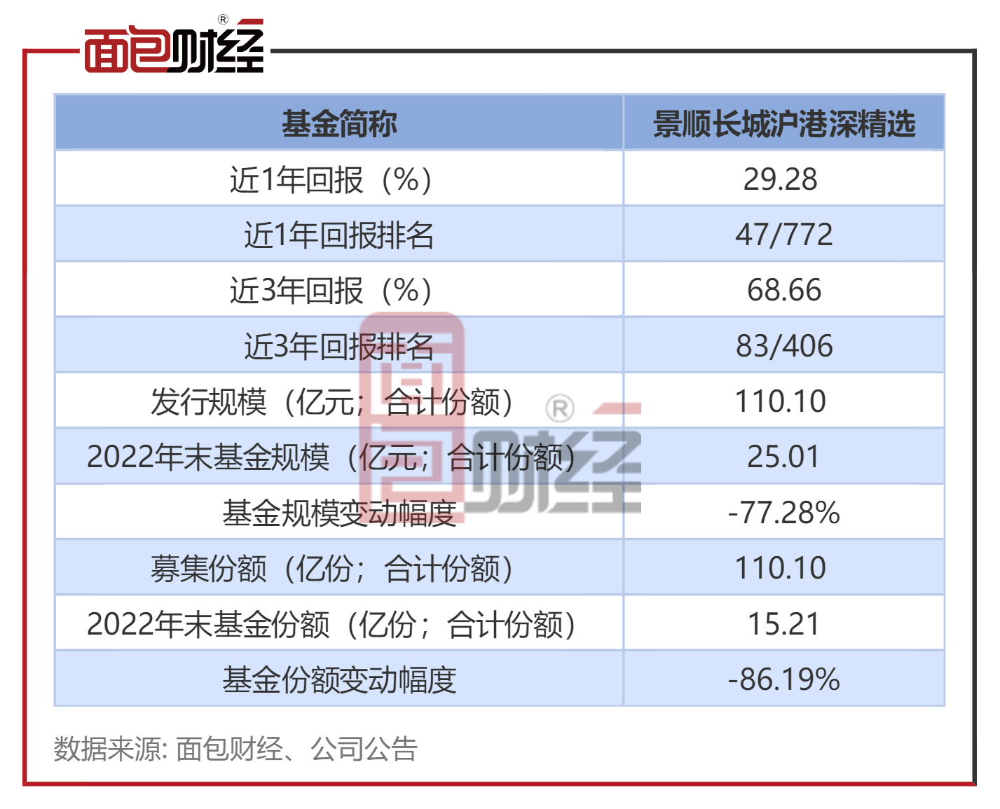 景顺长城沪港深精选的发行规模约110.10亿元(对应募集份额约110.10亿份)。2022年四季度末,该基金的基金资产净值约为25.01亿元、基金份额总额约为15.21亿份,分别下降约77.28%、86.19%。
