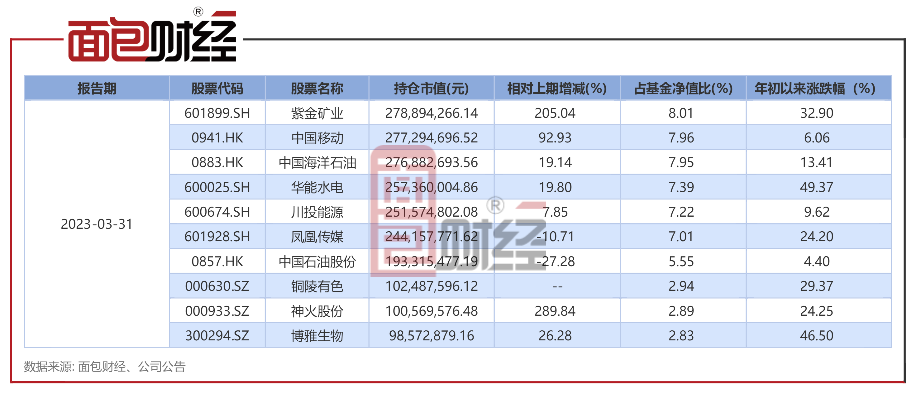 前三大重仓股:紫金矿业、中国移动、中国海洋石油