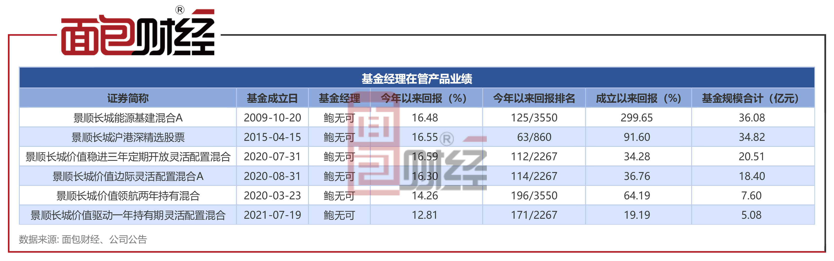 目前,鲍无可主要管理景顺长城能源基建混合、景顺长城沪港深精选股票、景顺长城价值稳进三年定期开放灵活配置混合等6只产品(包括共同管理产品),上述产品合计规模约122.49亿元。