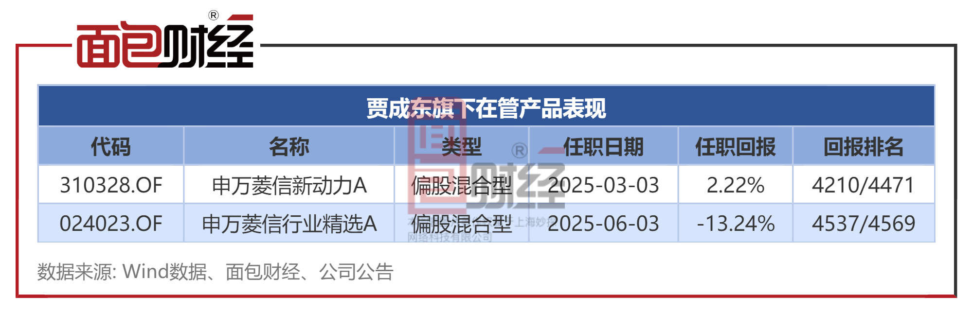Wind数据显示,截至2026年3月13日,贾成东在申万菱信新动力A的任职回报为2.22%,跑输业绩比较基准超10个百分点。