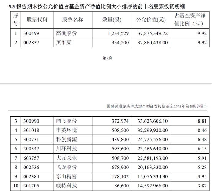 截至2025年四季度末,基金重仓股主要包括高澜股份、英维克、同飞股份、申菱环境等。相较三季度末,公司四季度末的重仓股大幅变更。