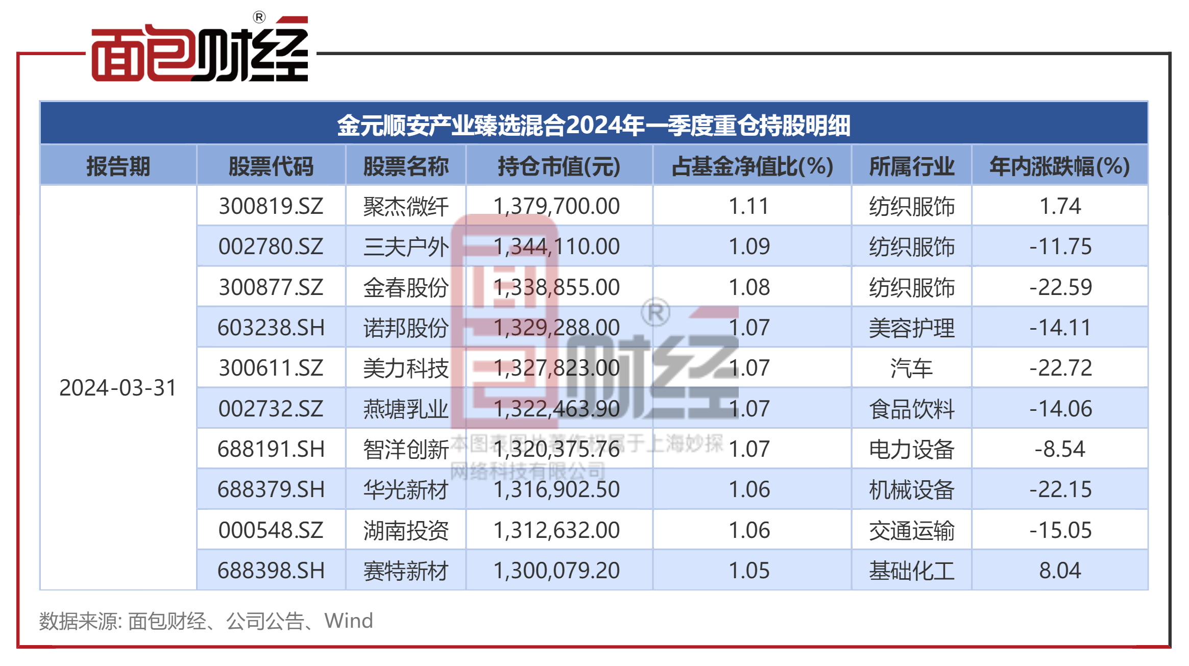 按申万一级行业分类,金元顺安产业臻选混合2024年一季度末前十大重仓股广泛分布于纺织服饰、美容护理、汽车、食品饮料、电力设备、机械设备、交通运输、基础化工等行业,行业集中度较低。