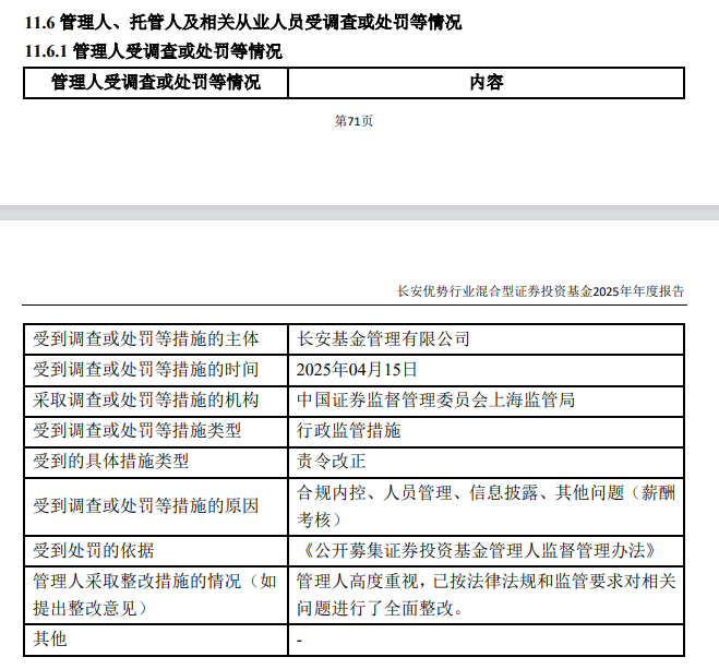 值得注意的是,长安基金2025年曾因合规内控、人员管理、信息披露、其他问题(薪酬考核)原因被中国证券监督管理委员会上海监管局采取行政监管措施,被要求责令改正。