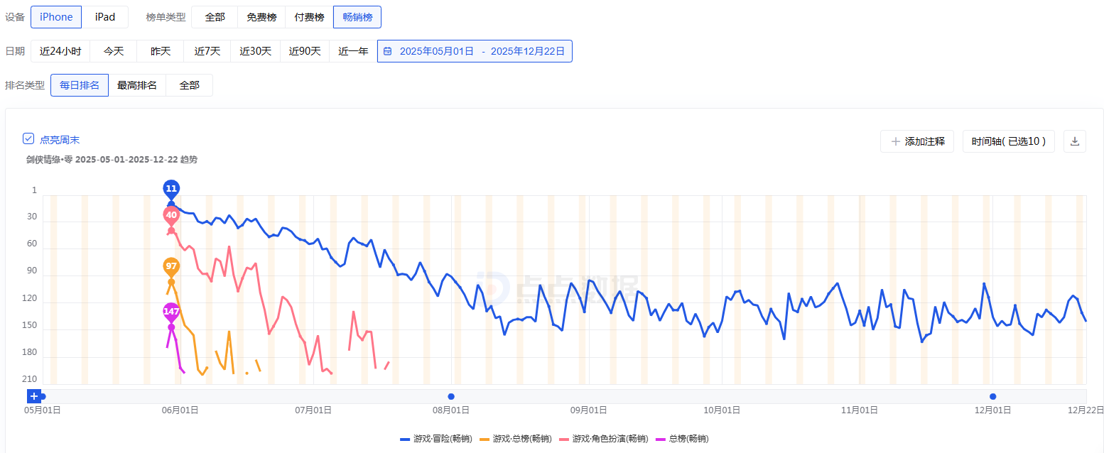 根据全球移动应用、游戏数据监测服务商点点数据的监测,2025年5月上线以来,《剑侠情缘·零》表现较为平淡,上线之初在中国内地的iOS游戏畅销榜排名最高升至97名,此后排名波动下滑。