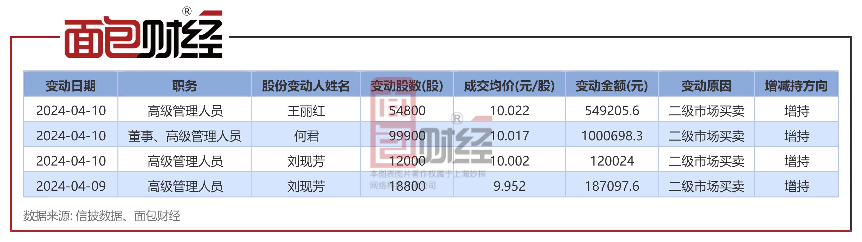 信披数据显示,2024年4月10日,梅花生物(600873.SH)高级管理人员刘现芳通过二级市场买卖增持1.2万股 ,成交均价为10.00元/股 ,增持金额为12万元,变动后持股数为18.74万股。