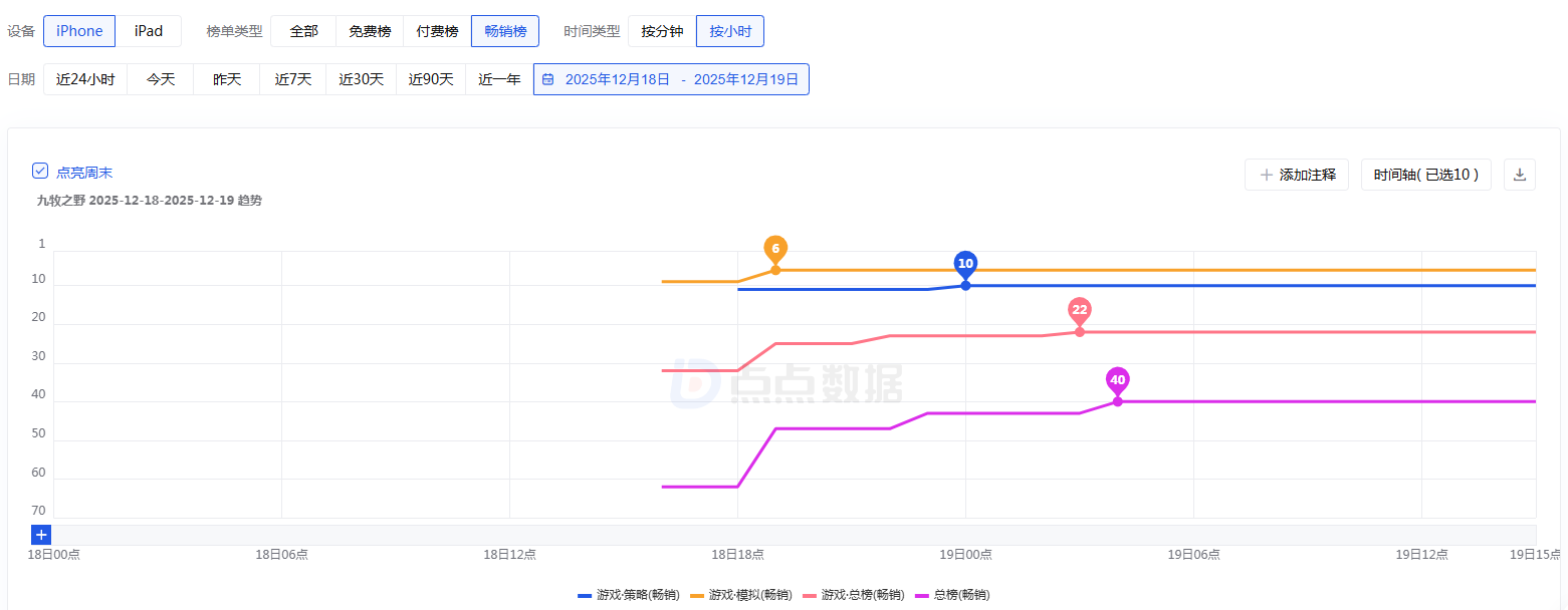 畅销榜方面,《九牧之野》于12月18日在中国内地iOS游戏畅销榜排名最高达到第23名。