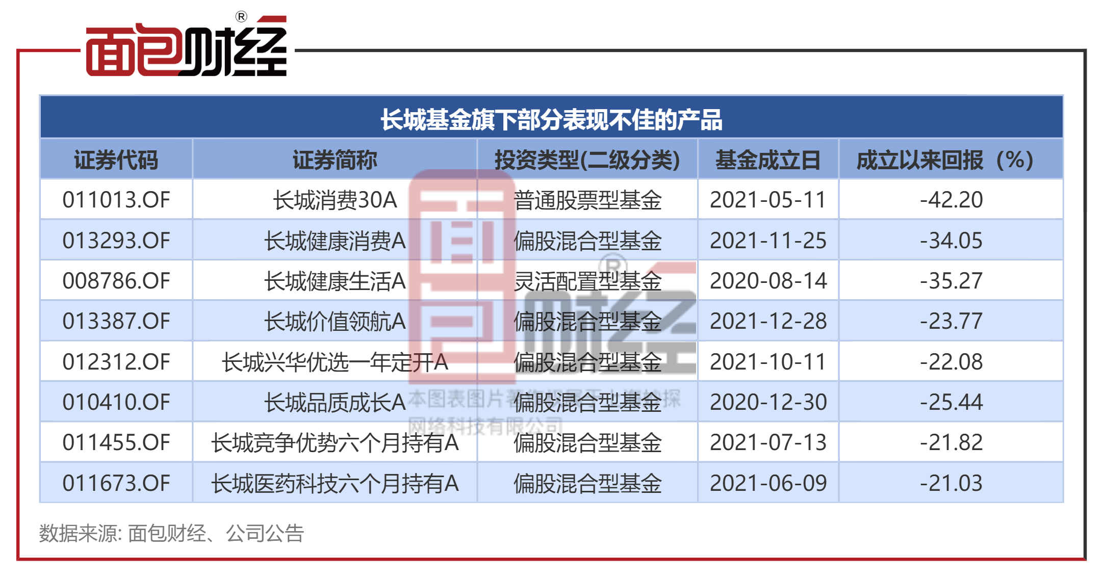 面包财经梳理公开资料显示,长城基金在管的多只产品成立以来净值处于浮亏状态,包括长城消费30A、长城健康生活A、长城健康消费A等产品,使投资者利益深度受损。