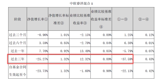 Wind数据显示,截至2026年4月24日,中欧睿泽A成立四年多以来净值下跌20.91%,跑输业绩比较基准超过25个百分点。