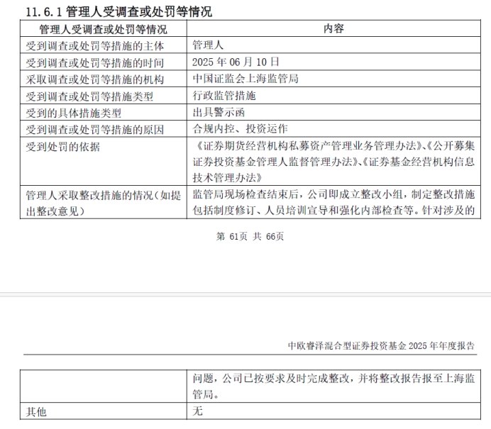 值得注意的是,中欧基金2025年曾因合规内控、投资运作问题被中国证监会上海监管局出局警示函。