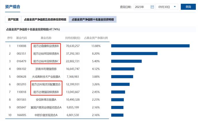该基金重仓的产品包括易方达稳健收益债券B、易方达裕祥回报债券A、易方达裕丰回报债券C等多只易方达基金旗下产品。