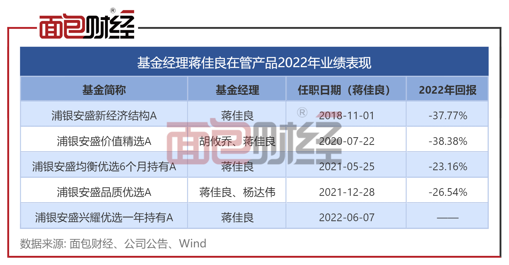 截至2022年末,蒋佳良共管理5只产品,合计管理规模超过36亿元。除了2022年新成立的浦银安盛兴耀优选一年持有A,其余产品2022年平均回撤超过30%。