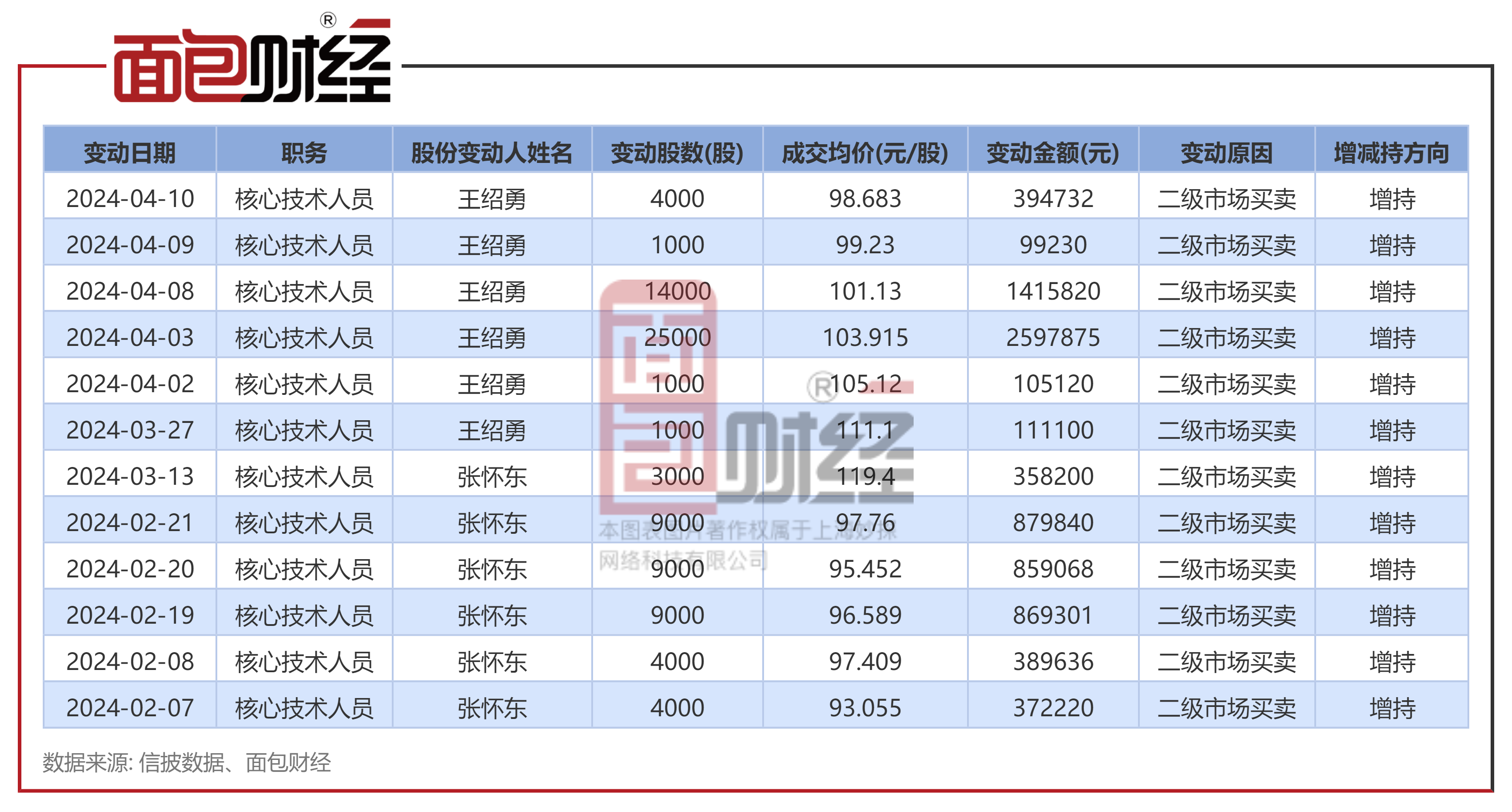 信披数据显示,2024年4月10日,芯源微(688037.SH)核心技术人员王绍勇通过二级市场买卖增持0.4万股 ,成交均价为98.68元/股 ,增持金额为39.47万元,变动后持股数为4.6万股。