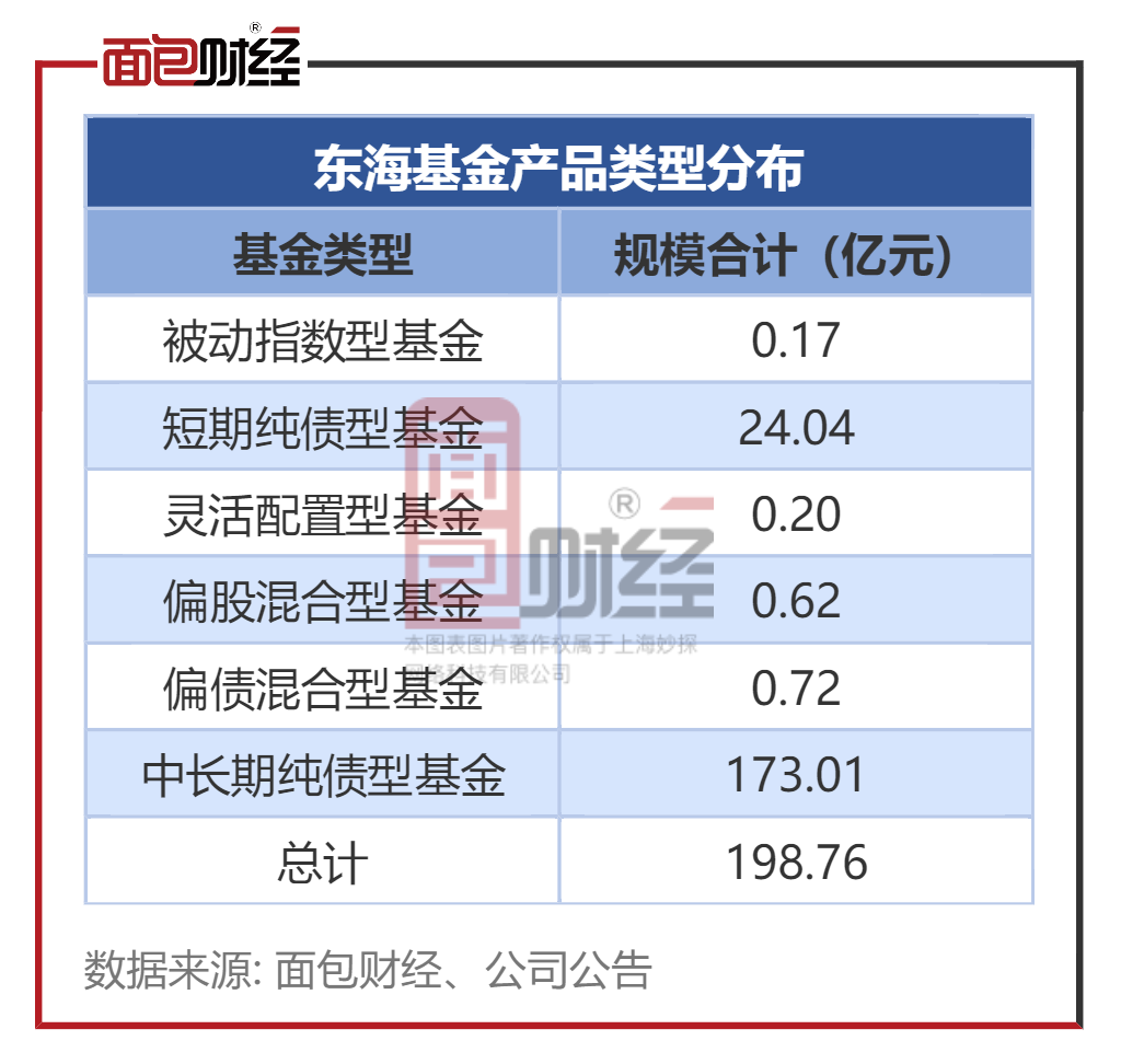 东海基金于2013年2月25日成立,第一大股东为东海证券。规模方面,截至三季度末,东海基金管理规模近200亿元,但6只主动权益型产品(包括灵活配置型、偏股混合型)合计规模不足1亿元。
