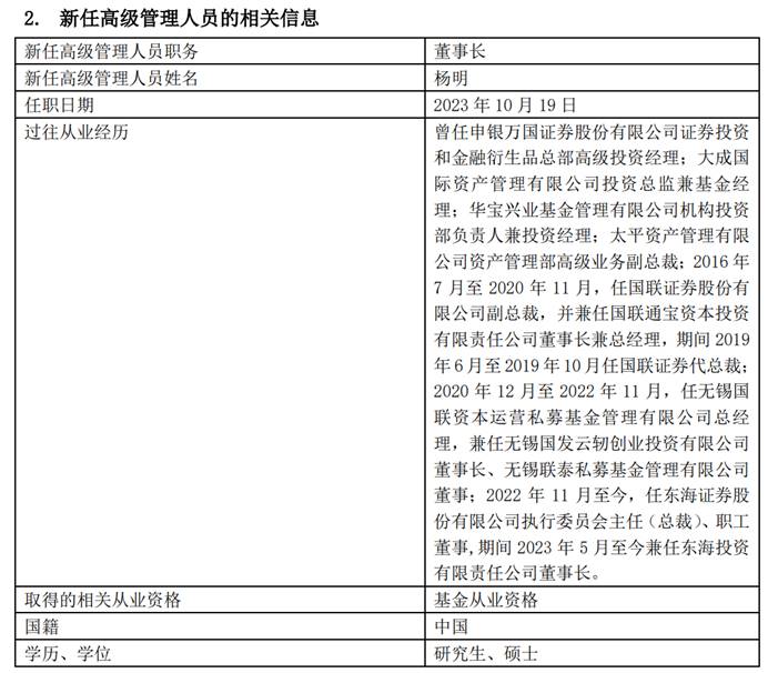 近日,东海基金披露公告,聘任杨明为公司董事长,原董事长殷建华因退休离任。