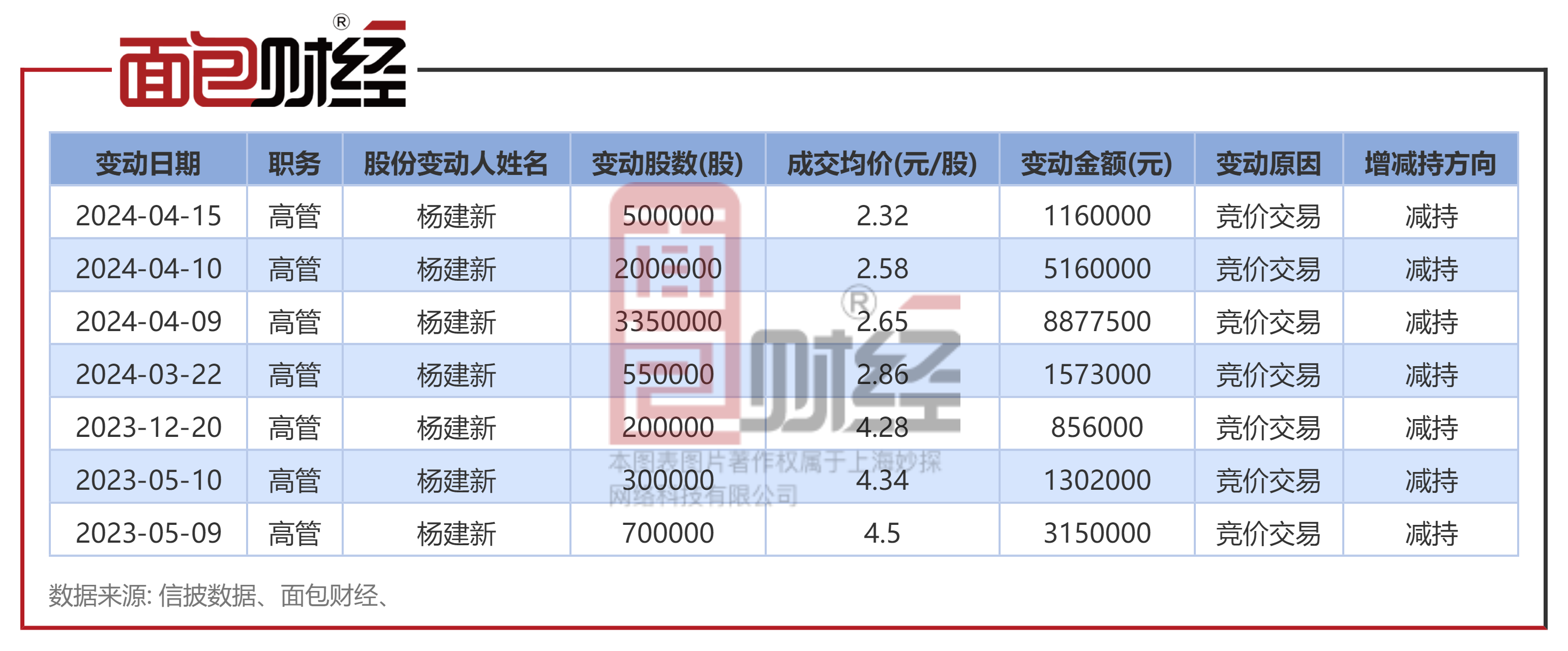 信披数据显示,2024年4月15日,跨境通(002640.SZ)高管杨建新通过竞价交易减持50万股 ,成交均价为2.32元/股 ,减持金额为116万元,变动后持股数为15515.46万股。