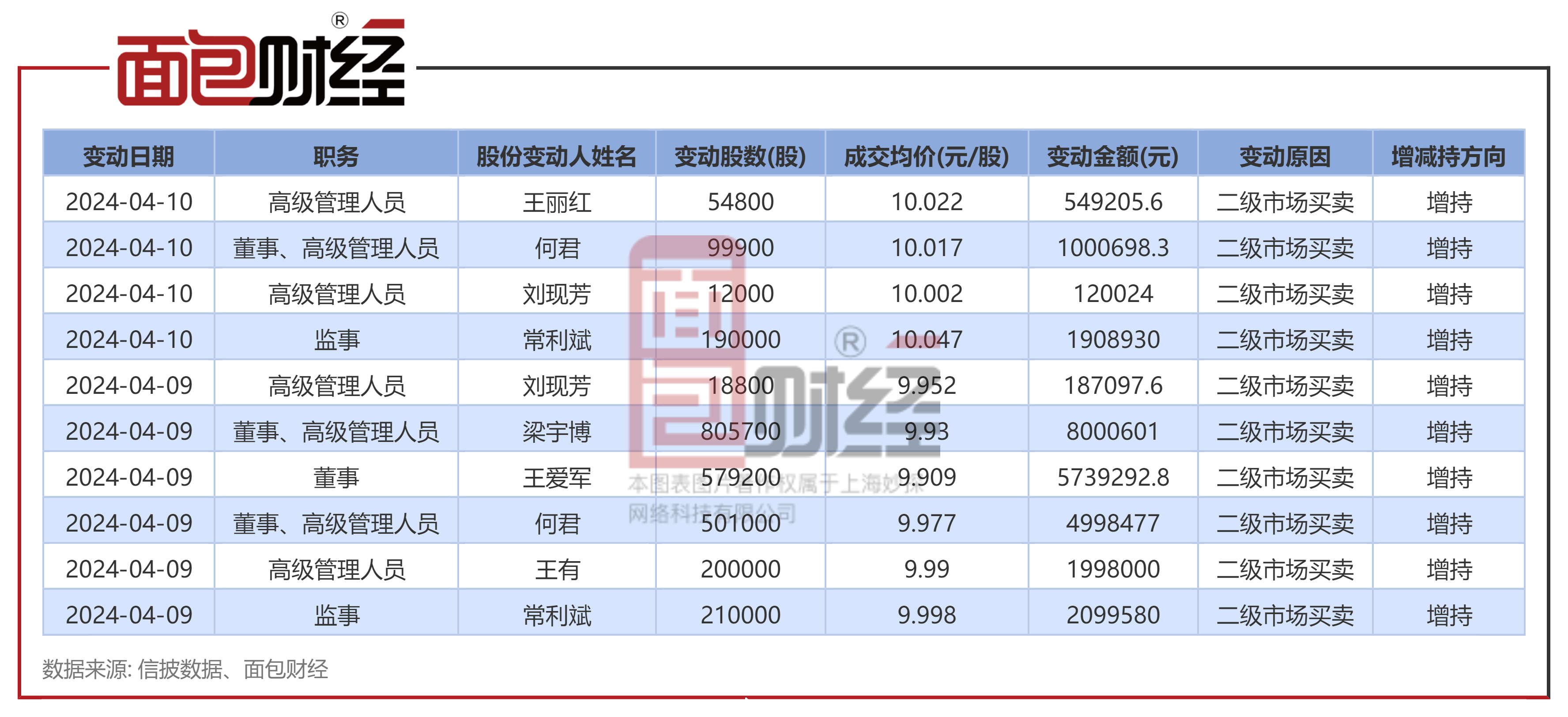 面包财经梳理上交所披露数据显示,近半年来,公司董事、监事、高级管理人员、核心技术人员合计增持10次,合计增持267.14万股 ,合计增持金额为2660.19万元。