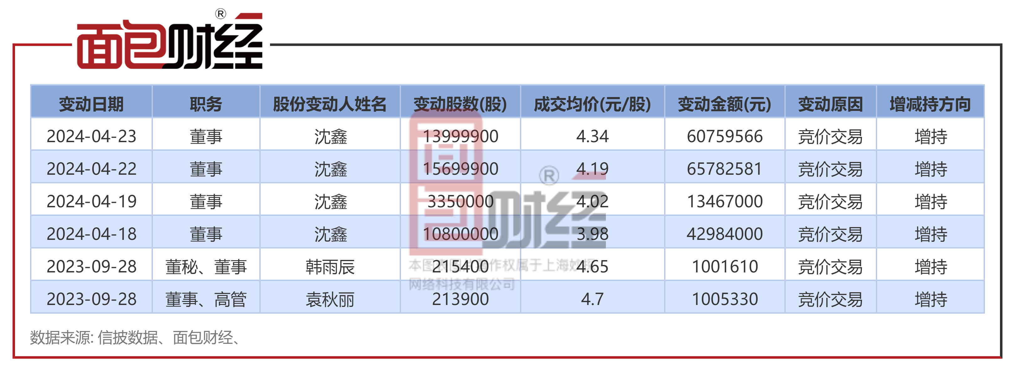 信披数据显示,2024年4月23日,中核钛白(002145.SZ)董事沈鑫通过竞价交易增持1399.99万股 ,成交均价为4.34元/股 ,增持金额为6075.96万元,变动后持股数为4384.99万股。