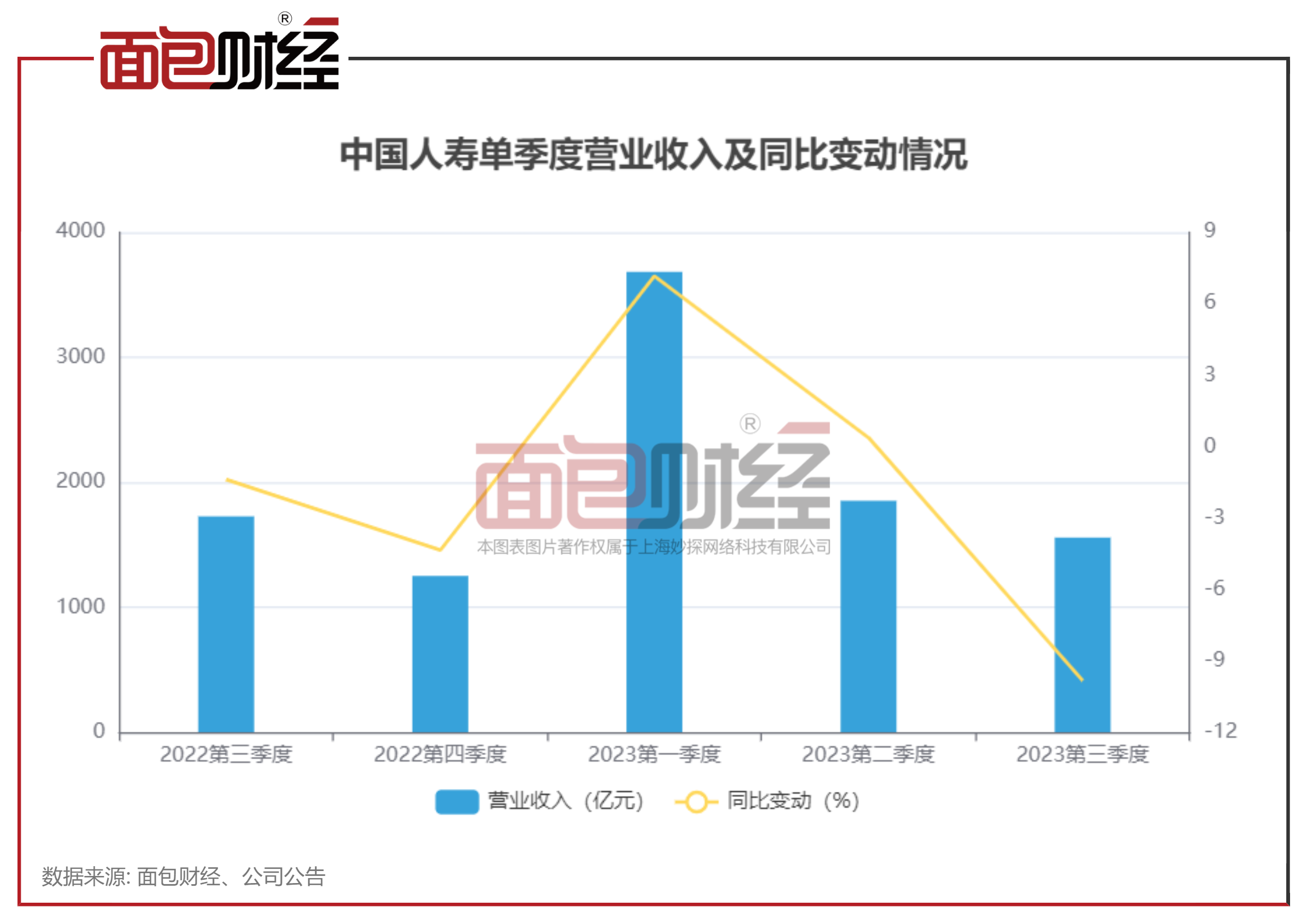 历史信息显示,今年以来,中国人寿的营收及其增速已连续两个季度下降。数据显示,前三个季度,公司营收分别为3683.85亿元、1852.1亿元、1557.38亿元,较去年同期相比,增速分别为7.2%、0.4%、-9.8%。
