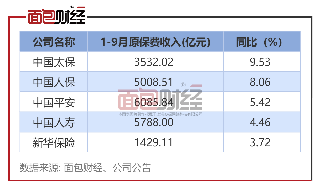 除此之外,根据A股5家上市险企前三季度原保费统计,中国人寿实现原保费收入增长,但增速倒数第二。数据显示,前三季度中国人寿实现原保费收入5788亿元,同比增长4.46%。